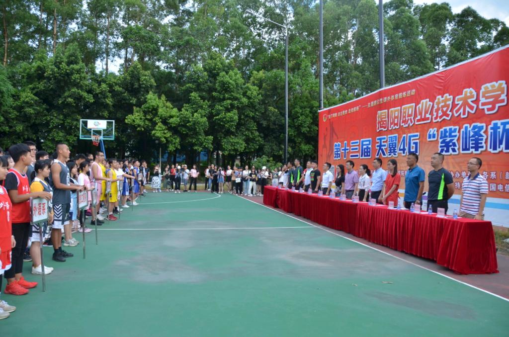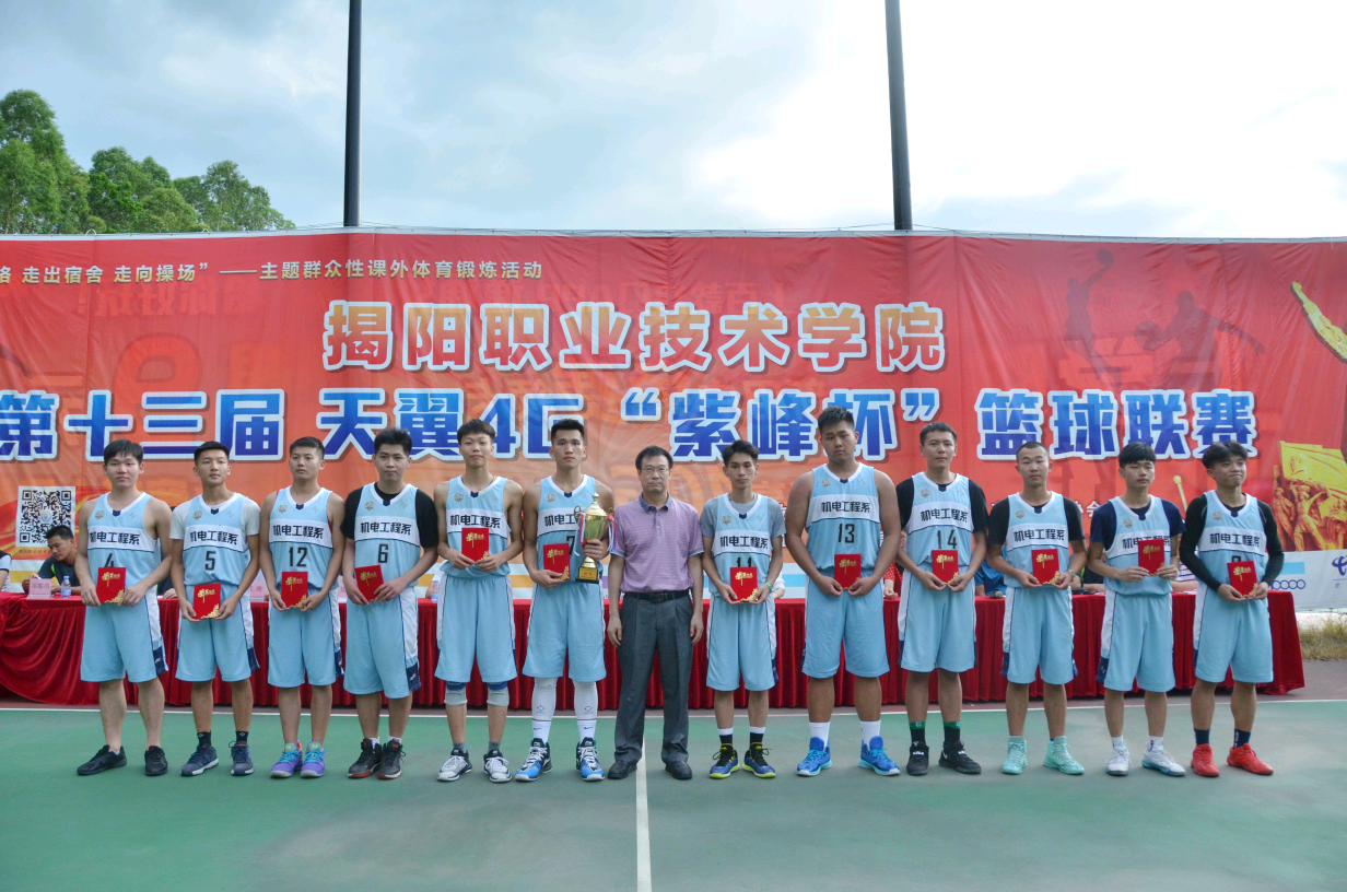 6月14日下午,太阳成官网第十三届“紫峰杯”篮球赛决赛暨颁奖仪式在学校灯光篮球场举行。学校党委副书记、纪委书记姚玉平,中国电信揭阳公司总经理王彩玲,学校有关部门、党总支负责人和师生一同观看比赛,并为获奖代表和个人颁奖。经过激烈的角逐,机电系男篮代表队夺得了本次比赛的男篮冠军。