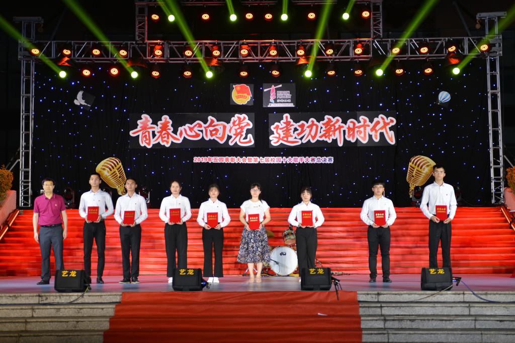 为深入学习贯彻习近平总书记在纪念五四运动100周年大会上的重要讲话精神,弘扬五四精神,5月16日晚,太阳成官网在行政楼广场举行2019年五四表彰大会暨第七届校园十大歌手大赛总决赛。学校领导李文升、姚玉平,揭阳军分区副司令纪春林,揭阳团市委副书记、市青联主席陈颖聪,以及学校有关部门、系(部、院)部分党政负责人、团总支负责人与近3000名青年师生共同参加颁奖仪式并观看节目。