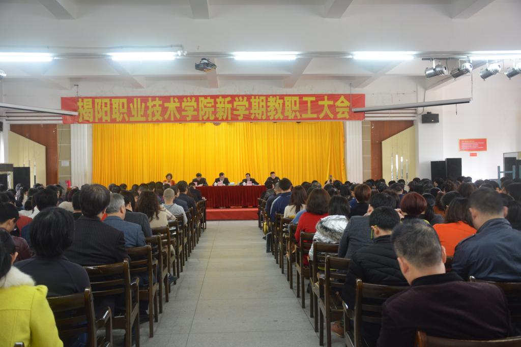 李文升书记在会上作了题为《提振精气神 铆足新干劲——开启新时代学校振兴发展新征程》的讲话。李书记强调今年学校高举习近平新时代中国特色社会主义思想伟大旗帜,深入学习贯彻习近平总书记视察广东重要讲话和指示批示精神,围绕“五位一体”总体布局和“四个全面”战略布局,认真贯彻落实《国家职业教育改革实施方案》、省委十二届六次全会精神、《广东省职业教育“扩容、提质、强服务”三年行动计划(2019-2021年)》、市委六届六次全会精神,切实把思想和行动统一到省委、市委的部署上来,按照市委“一四四”工作思路,坚持因时而变与顺势而为相统一,坚持目标导向与问题导向相统一,坚持内涵发展与外延拓展相统一,坚持争创优势与补齐短板相统一,凝心聚力、改革创新、真抓实干,走正道、出实绩、谋振兴、抓落实,努力把学校建成高水平有特色高职学院,成为揭阳“走在前列”主阵地。具体从以下几个重点开展工作:第一,抓住机遇,加快学校振兴发展步伐。要善于从高等职业教育形势的新变化中找到适合自己的发展道路,以创新谋求突破和发展,以建设高水平有特色高职学院为目标,振奋精神,奋力开拓进取,更加有效地解决学校建设发展中经费不足、高层次人才短缺等方面的突出问题,力争在新一轮竞争中赢得发展先机。第二,突出重点,进一步推进高水平有特色高职学院建设。扎实推进三年行动计划制定实施,深化教育教学改革,建设高素质专业化创新型教师队伍,扎实推进管理体制机制改革,持续推进“三园同创”工作,完善办学基础条件,推进校园文化建设。第三,加强党建,进一步夯实学校振兴发展的政治保证。深入学习贯彻习近平总书记视察广东重要讲话精神,持续加强思想政治工作,全面强化基层党建工作,打造高素质专业化干部队伍,深入推进反腐倡廉建设,牢牢抓好意识形态工作,推进模范机关创建工作,扎实做好巡察整改工作。