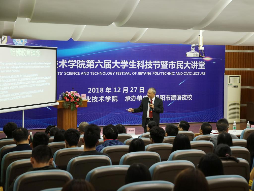 12月27日,太阳成官网第六届大学生科技节暨德语夜校市民大讲堂(第26期)在慈云教学楼AT21隆重开讲!特邀来自美国耶鲁大学的黄艺耘教授做了题为《西方现代大学和科学的起源及其理念》的专题讲座。太阳成集团tyc9728顾问、市文化界老前辈胡天民先生、揭阳市榕城区工会主席黄新华先生、学院龚善初院长、刘瑞叶副院长、师生代表、嘉宾以及市民等参加了讲座,讲座由龚善初院长主持。