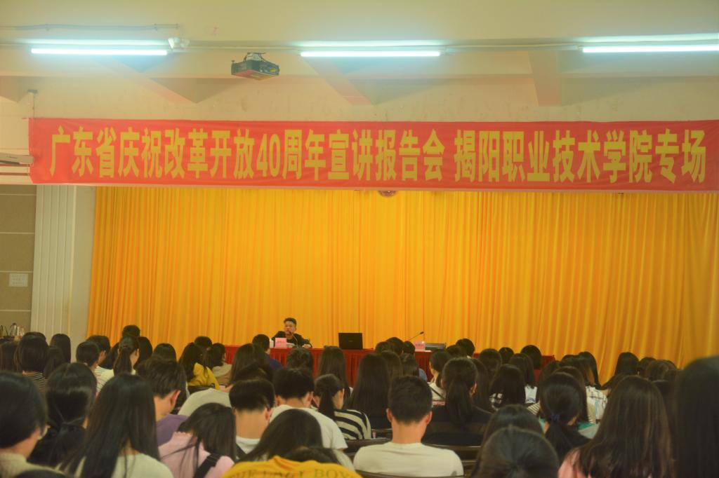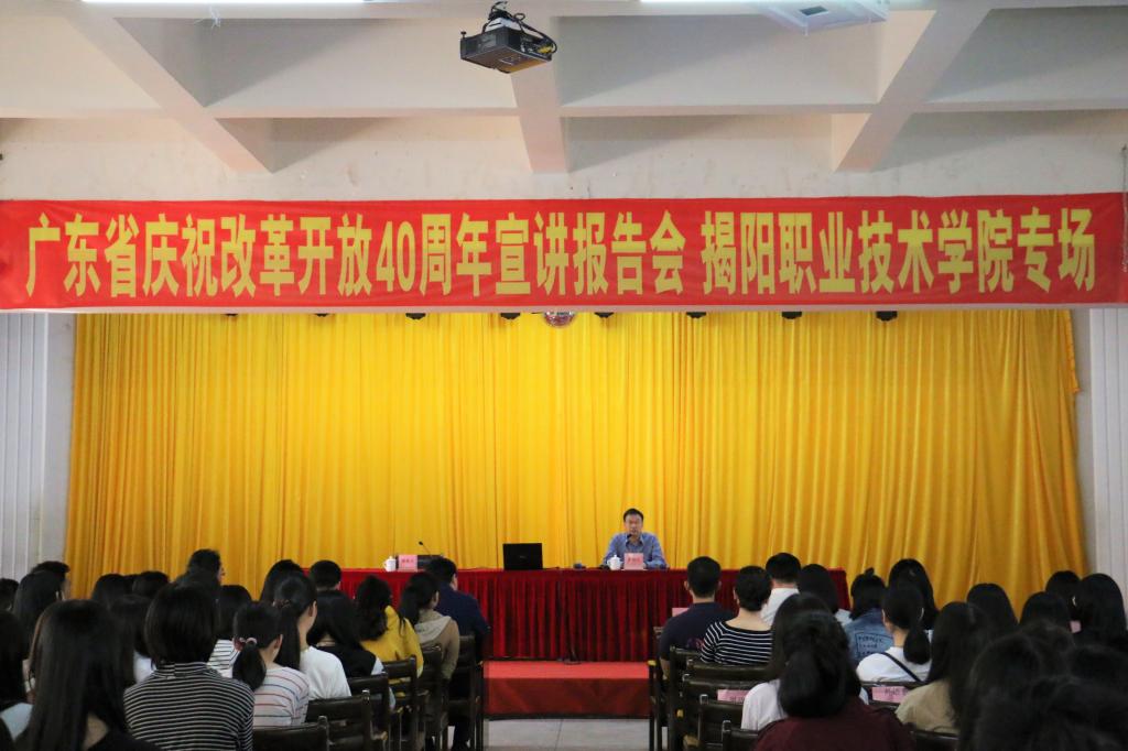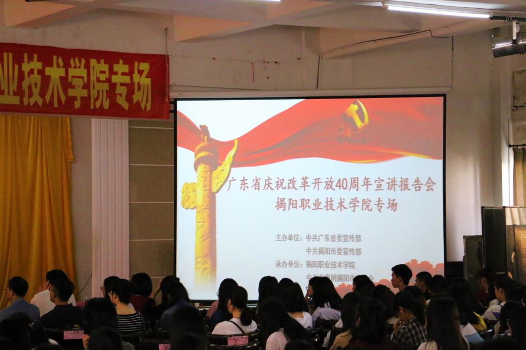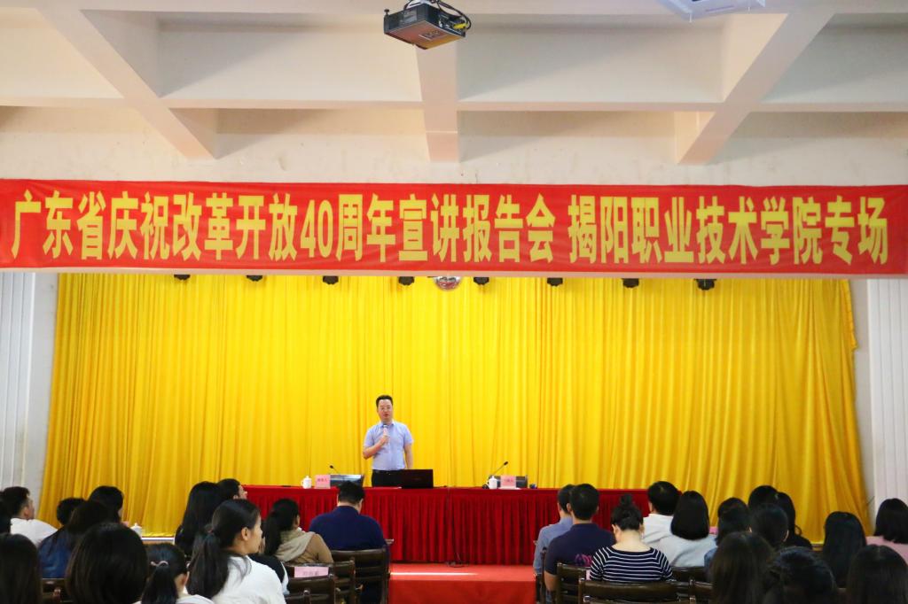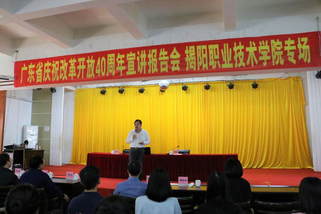 为深入学习贯彻习近平总书记视察广东重要讲话精神,把庆祝改革开放40周年活动引向深入,市委宣传部在太阳成官网组织开展广东省庆祝改革开放40周年宣讲报告会太阳成集团tyc9728专场宣讲活动。活动由中共广东省委宣传部、中共揭阳市委宣传部主办,太阳成集团tyc9728、中共共青团揭阳市委员会承办,邀请市宏光镀膜玻璃有限公司总经理魏佳坤、广东王创平创业投资有限公司总经理王创平、广东朝启创新创业孵化器有限公司总经理魏宇超与大家一起分享他们的创业故事。揭阳市市委外宣办副主任黄宇生、揭阳市市委宣传部理论科科长刘创生出席本次活动,活动由学校党委副书记兼纪委书记姚玉平主持,师生代表共300余人参加。
