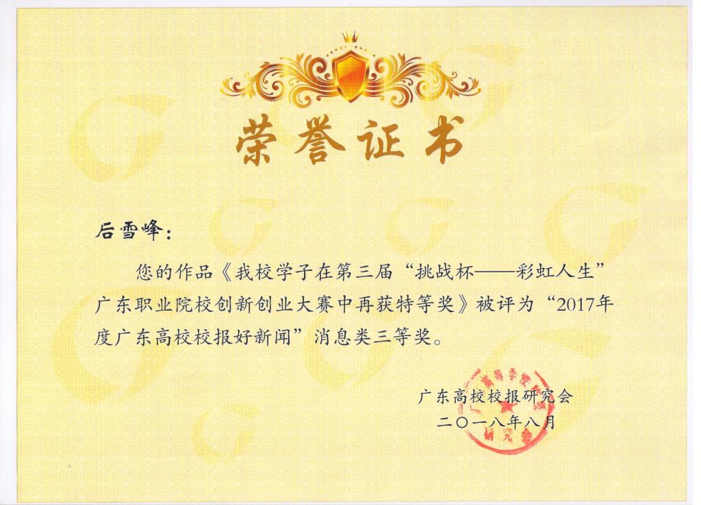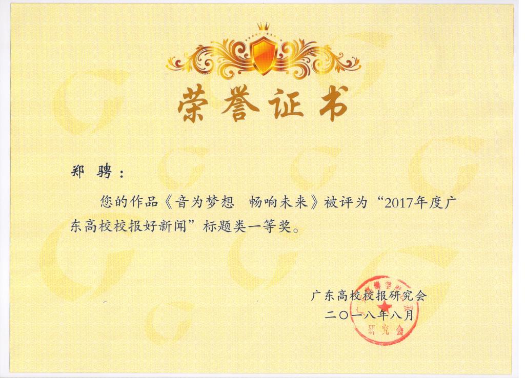 太阳成集团tyc9728校报获奖作品有:郑骋的作品《音为梦想 畅响未来》获标题类一等奖;林秀玲的作品《礼赞十九大 唱响新时代》获标题类二等奖;杨晓纯的作品《创文——我们在行动》获版面类三等奖;后雪峰的作品《太阳成官网学子在第三届“挑战杯——彩虹人生”广东职业院校创新创业大赛中再获特等奖》获消息类三等奖。