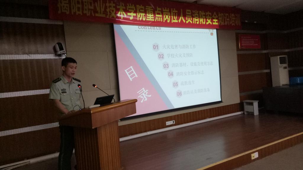 培训会,邀请市消防局榕城大队刘教官主讲,刘教官首先播放了近期国内外大量火灾事故案例,讲解火灾是如何发生及蔓延的。影片中触目惊心的画面,让大家深刻感受到火灾带来的巨大人员伤亡及财产损失。刘教官同时为大家讲解了火灾的危害、学校发生火灾的种类以及预防工作,传授了如何正确使用家庭电器、火情紧急情况处置方法、火灾应急疏散及火场自救互救等内容。