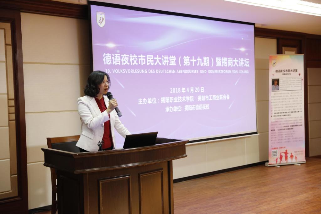 4月20日晚,市德语夜校联手揭阳市工商联举办主题为《欧盟的精明专业化发展策略——以波兰为例》的第十九期《市民大讲堂》暨揭商大讲坛在揭阳市委党校开讲。讲堂邀请德国帕德邦大学经济学博士、经济学博士后,曾任德国弗莱贝格工业大学经济学教授、副校长,现为波兰波兹南经济大学客座教授、博导贺斯特.布热津斯基(Horst Brezinski)担任主讲,广大市民和揭商企业代表踊跃报名参加并聆听讲座。学院院长龚善初、市工商联副主席郑武标、学院副院长刘瑞叶、成教处处长王创锋等参加讲座。