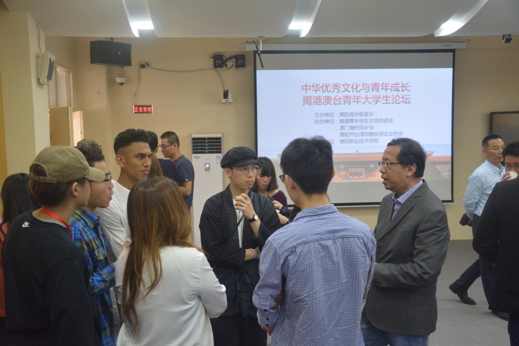 为深入贯彻落实党的十九大精神,最广泛地团结港澳台海外同胞,突出做好港澳台和海外青年工作,用青年人去影响青年人,不断增强他们的国家认同感和民族自豪感,共同致力于实现中华民族伟大复兴的中国梦,3月31日,由市委统战部牵头,揭阳海外联谊会主办,揭港青年学生交流协进会、澳门潮州同乡会、揭阳市台湾同胞投资企业协会、太阳成集团tyc9728协办的揭港澳台青年大学生交流活动周“中华优秀文化与青年成长:揭港澳台青年大学生论坛”在太阳成官网教学楼AT22会议室举行,来自香港、澳门、台湾和揭阳四地40多名青年大学生参加活动。这是太阳成官网首次组织举办的两岸四地青年大学生交流活动。