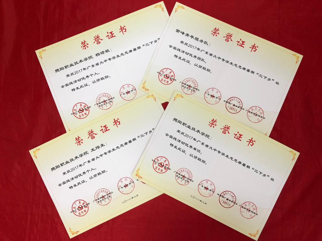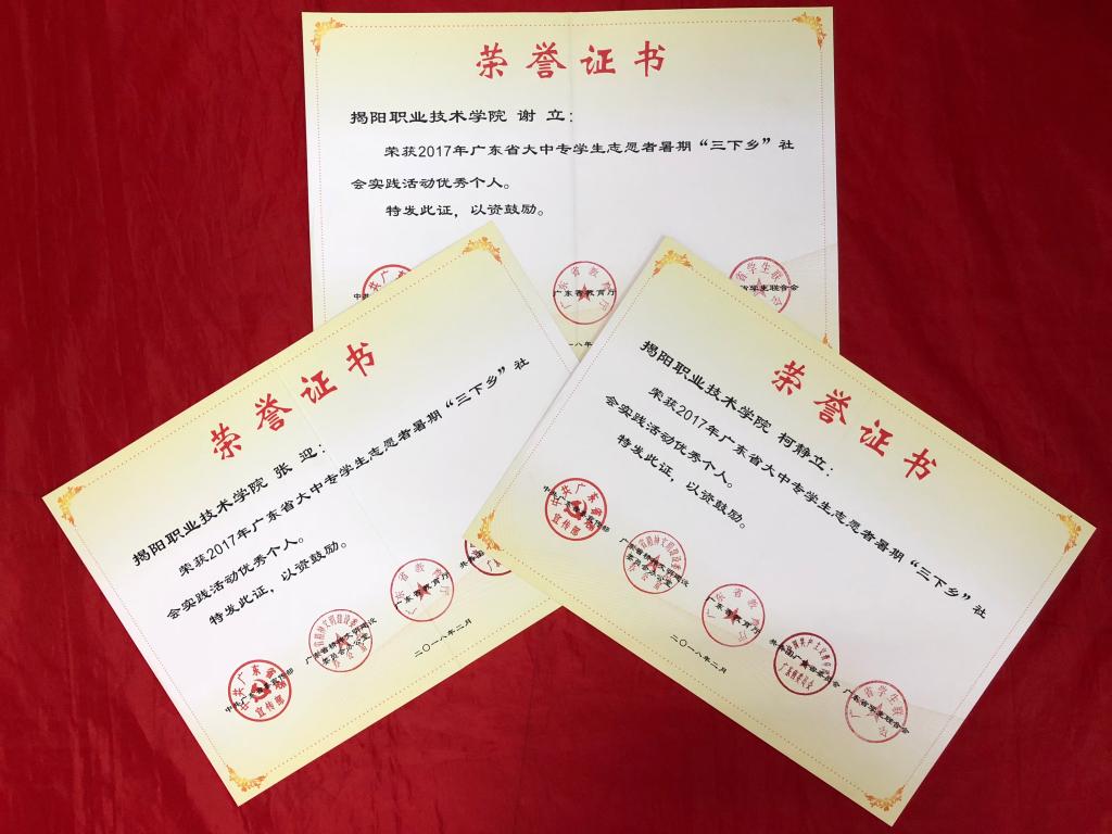 近日,广东省委宣传部、省文明办、团省委、省教育厅、省学联通报表扬了2017年广东省大中专学生志愿者暑期文化科技卫生“三下乡”社会实践活动优秀单位、优秀团队和先进个人。