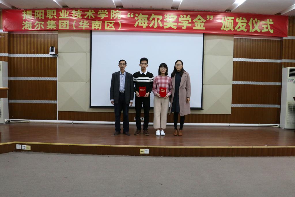 王烁生处长代表学院宣读获奖名单,本次获2017届“海尔奖学金”学生共9名,其中一等奖2名、二等奖3名、三等奖4名,奖学金额共16000元。龚院长和何潇潇经理亲自为获奖学生颁发证书和奖金,获奖学生代表向丽同学发表感言,感谢学校和海尔公司对他们的栽培和鼓励,表示将饮水思源、知恩图报,以不懈的努力,为公司的发展贡献力量,为学院争光。