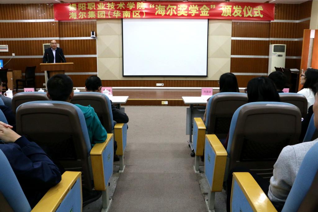 龚善初院长做了总结讲话,感谢海尔集团(华南区)相关领导专程到学校来颁发海尔奖学金,机电系与海尔公司在校企合作开展“订单式”、“厂中校”等办学模式改革方面取得突出成效,取得了很好的成功经验,同时祝贺即将走进海尔集团实习以及已经能够在海尔集团领悟和感悟海尔先进理念的应届及往届毕业生,龚院长表示充分赏识海尔集团OEC的管理理念,希望大家经过不断努力,坚定信念,不计辛劳,务实勤勉,认认真真地感悟海尔集团OEC先进管理理念,成为未来的CEO,希望大家不要辜负海尔集团的希望,不要辜负机电工程系全体师生包括学院的希望。最后海尔奖学金颁发仪式在热烈掌声中圆满结束。