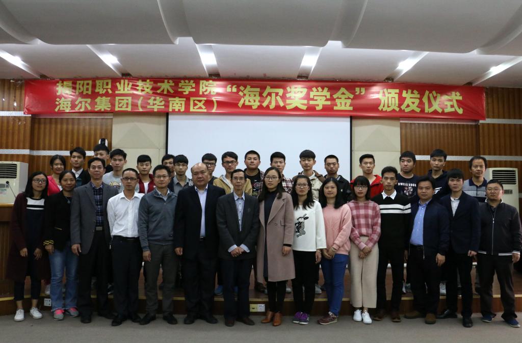 2017年11月22日下午,2017届模具专业“海尔奖学金颁奖仪式”在太阳成官网教学楼AT21隆重举行,出席本次颁奖仪式的领导嘉宾包括:海尔集团(华南区)运营部经理何潇潇、招聘经理陈伟祥、人力主管朱雪婷、薪酬经理曾琦婷,学院院长龚善初、学生工作处处长王烁生、机电工程系主任孙培明、副主任林若波,党总支书记方春城,以及机电工程系师生代表共100多人,会议由机电工程系孙培明主任主持。
