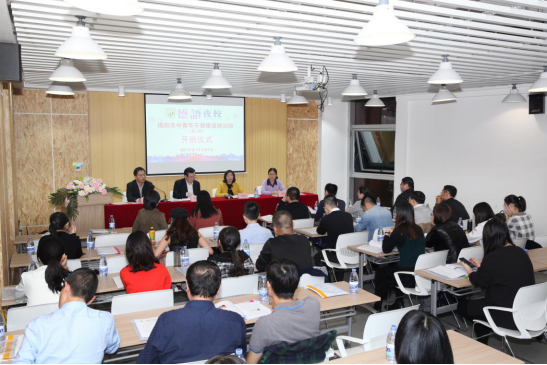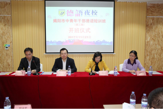 11月21日晚,揭阳市中青年干部德语短训班(第三期)在市区宝德数码广场五楼德语夜校教室顺利开班,来自市直党政部门32位中青年干部参加培训。学院党委书记李文升,学院副院长、德语夜校校长刘瑞叶、成教处处长王创锋、外语系负责人邱瑞君等出席开班典礼。开班仪式由王创锋处长主持。