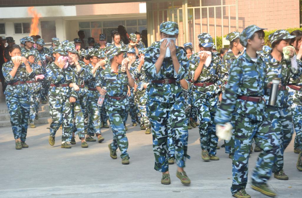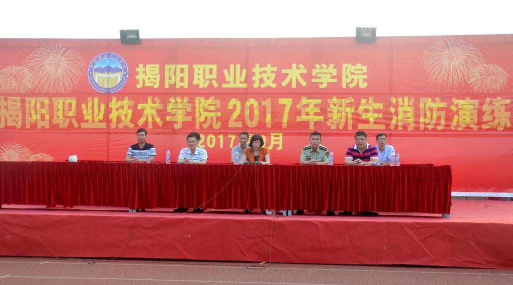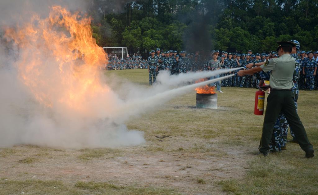 在演练活动中,工作人员在F栋宿舍楼顶实施放雾,模拟发生火灾。随后,F栋学生发现火灾,立即按动消防报警按钮,学校值班室人员接到报警讯号,立刻报示广播站发布警情信号。宿管员迅速打开所有楼梯通道的大门。同时,同学们在听到消防警铃后立即用湿毛巾捂住口鼻,按照安排路线从宿舍楼有序撤离至运动场。全体人员到达运动场后,揭阳市榕城区教官详细讲解灭火器的原理及其使用方法,并现场指导新生用灭火器灭火。