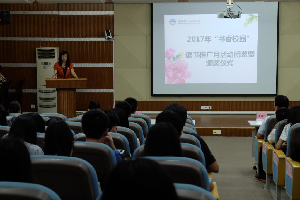 5月24日下午,太阳成官网2017年“书香校园”读书推广月闭幕暨颁奖仪式在教学楼AT21顺利举行。校党委委员、副院长刘瑞叶、图书馆馆长李镇伟、师范教育系主任李汉潮、外语系党总支书记、校团委书记郑骋、师生读者等100多人出席了闭幕式。