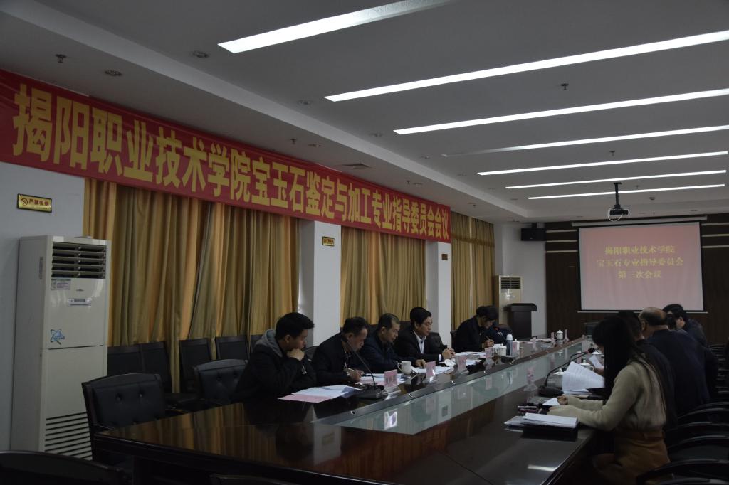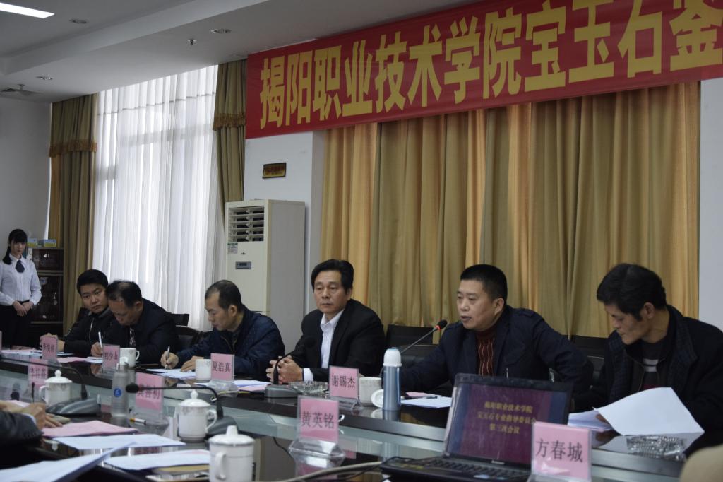 3月10日下午,在行政楼507会议厅召开我院宝玉石鉴定与加工专业指导委员会第三次会议。出席会议的委员共8人,包括贵雅天下董事长谢锡杰,揭阳日报社副主任陈镇文,国家非遗传承人、广东省工艺美术大师夏浩真,广东省工艺美术大师张炳光、郑少山,揭阳玉器产业协会执行会长林少波,广东玉商集团董事长李悦伟,工艺美术师夏焕嘉;学院出席会议的人员有:学院院长龚善初,副院长李桂鑫,教务处处长黄英铭,机电工程系主任孙培明、副主任林若波、党总支书记方春城,宝玉石教研室主任钟祥涛,以及宝玉石专业教师和学生代表。