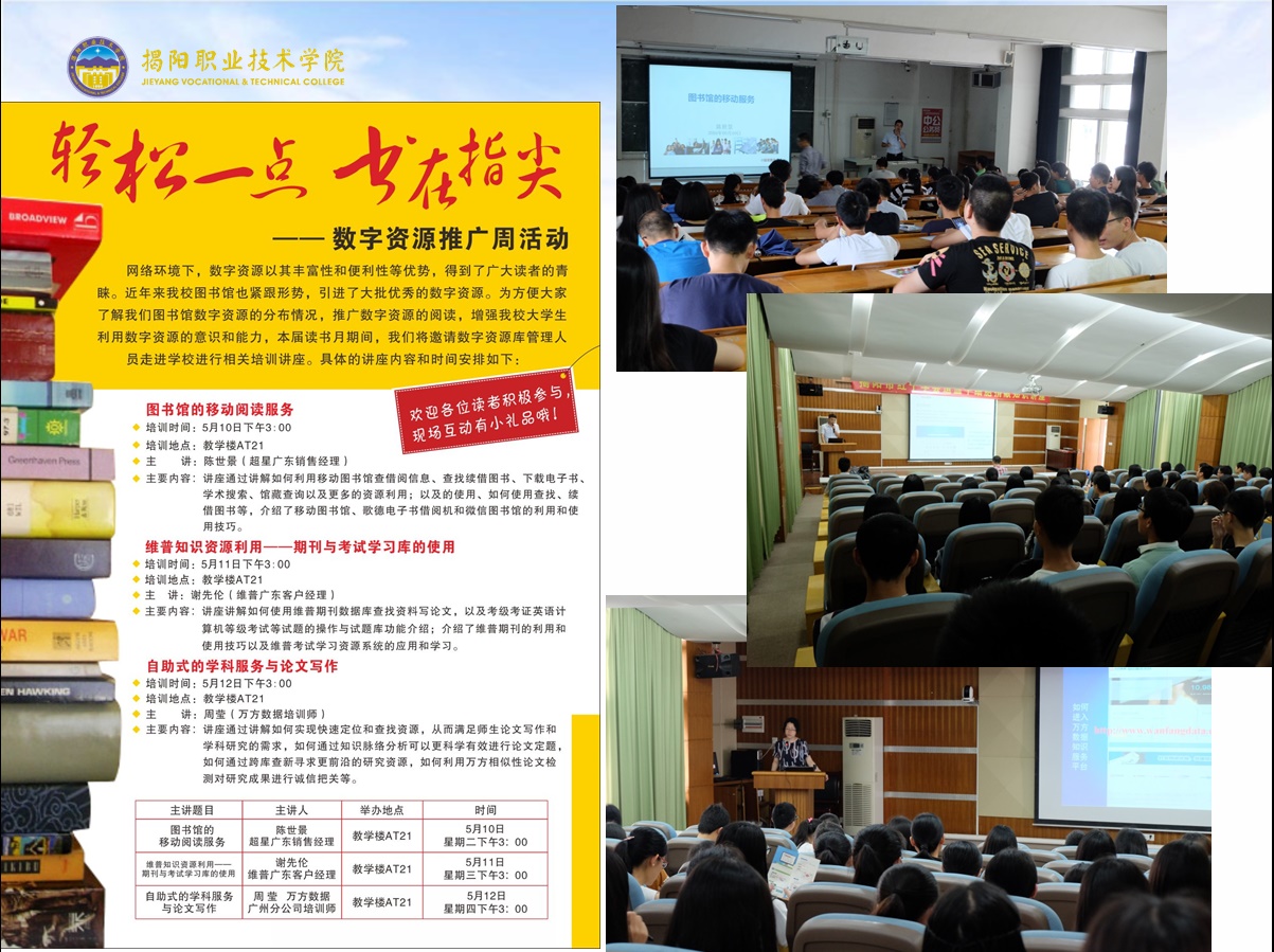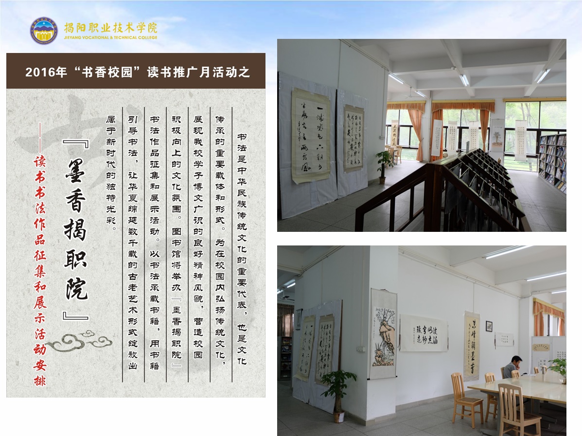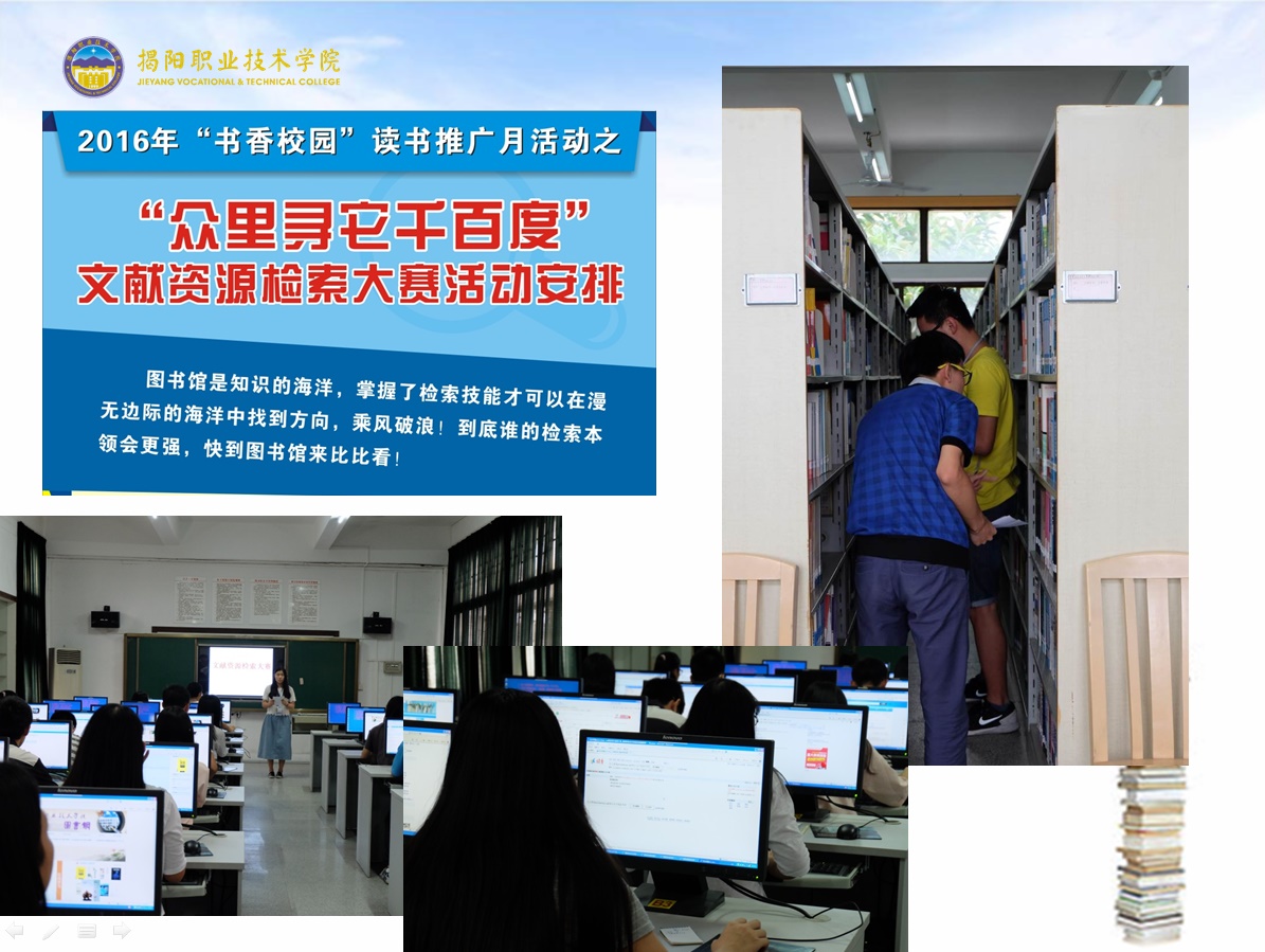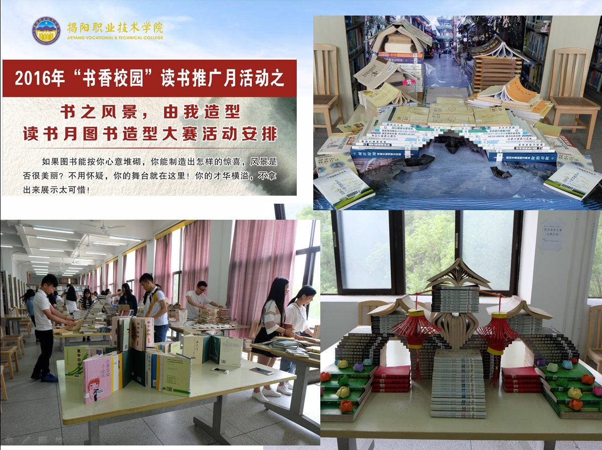 为纪念第21个“世界读书日”,营造“爱读书,读好书,好读书”的学习氛围,丰富校园文化生活、打造书香校园,从4月23日开始,由图书馆、院团委、师范教育系联合主办为期一个月的以“让读书成为时尚 让学习成为习惯”为题的读书月系列活动。经过一个月精心组织,包括“轻松一点,书在指尖”——数字资源利用的宣传与推广周活动、“书之风景,由我造型”图书造型大赛、“品读经典,传承创新”主题征文活动、“众里寻他千百度”文献资源检索大赛、“墨香揭职院”读书书法作品征集和展示、“博览达人”评选等赛事活动紧张、有序展开。