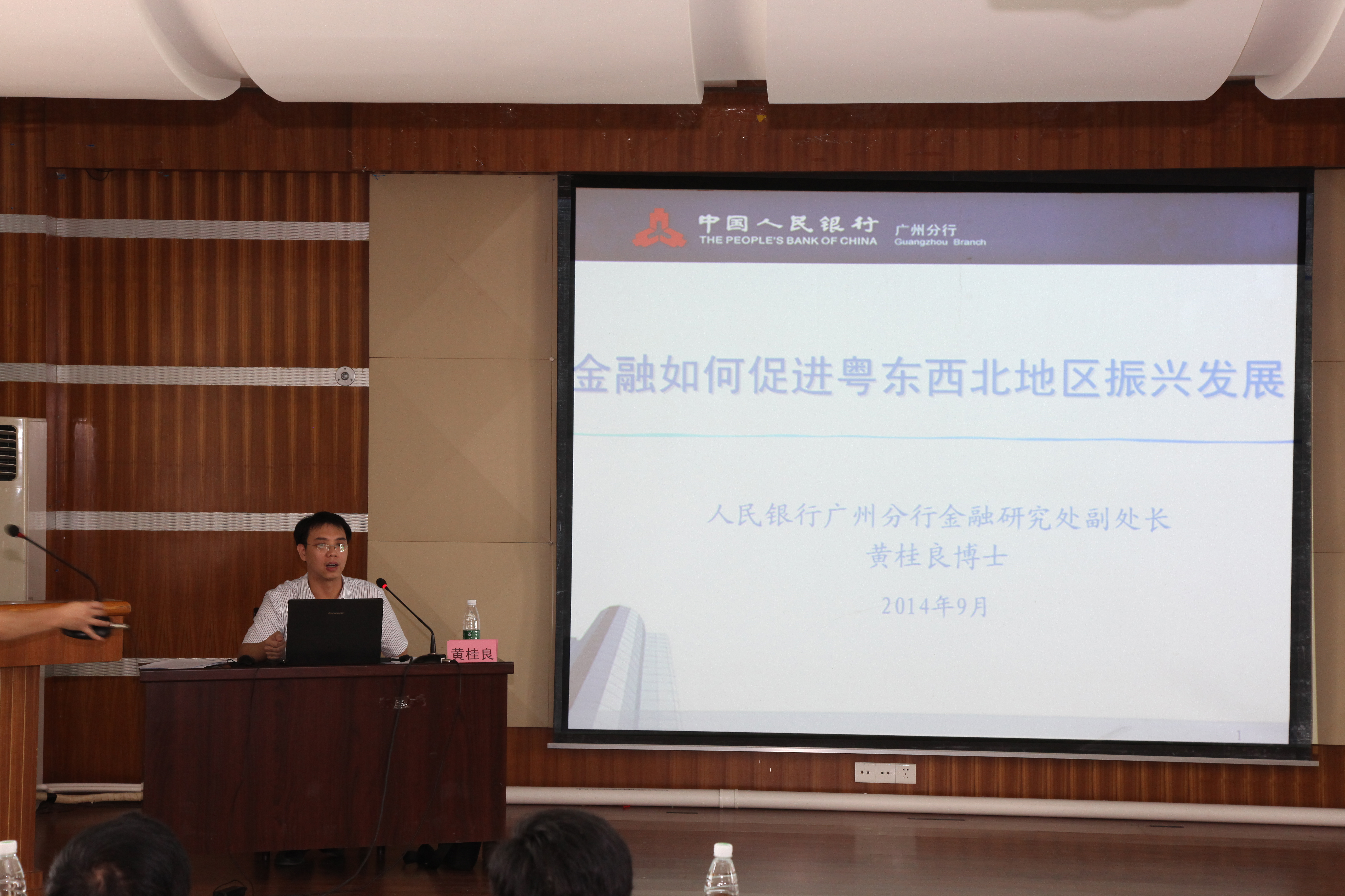 签字揭牌仪式结束后,省人行副处长黄桂良博士作了精彩的《金融如何促进粤东西北地区振兴发展》讲座。黄桂良副处长的讲座结合自己多年的研究成果,围绕金融如何促进粤东西北地区振兴发展的状况与成效、面临的主要问题以及对策建议等方面进行精辟的分析。详实精确的数据、殷实的理论以及深度的分析,使在场人员受益匪浅,博得大家的热烈掌声。