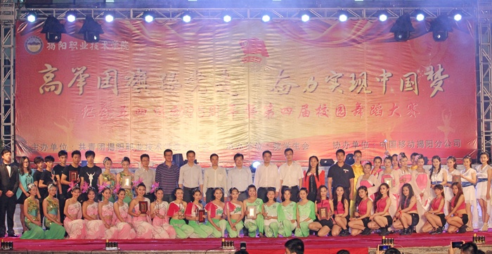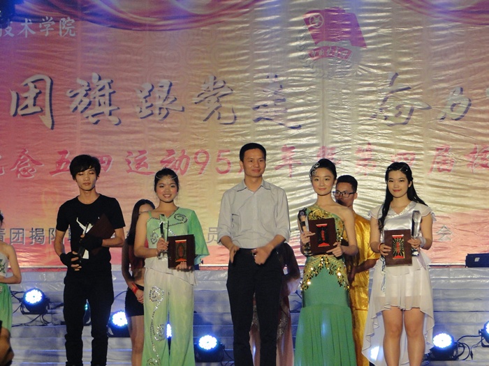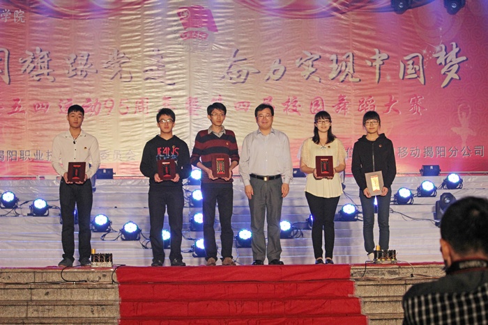 5月4日晚,我院纪念五四运动95周年表彰大会暨第四届校园舞蹈大赛总决赛在行政楼广场隆重举行。学院党委书记李文升、副院长李桂鑫、团揭阳市委副书记陈颖聪、揭阳移动榕城分公司总经理林海雄,以及学院有关处室、系部党总支的部分领导出席活动并与青年学生一起观看比赛。